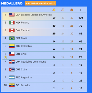 Detrás de los mexicanos y canadienses, Brasil se ubica en el cuarto sitio con 14 oros y un acumulado de 66 preseas. Renglón seguido se encuentra Colombia (6 y 29), la anfitriona Chile (5 y 28), la República Dominicana (4 y 12) y la otrora potencia continental Cuba (3 y 13).