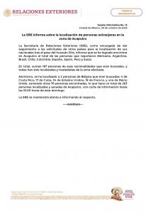 Por su parte, la Canciller Alicia Bárcena detalló que "se han encontrado al total de nacionales de Alemania, Argentina, Brasil, Chile, Colombia, España, Japón, Perú y Suiza". "Son 263 personas ya trasladadas. Seguimos atentos", completó.