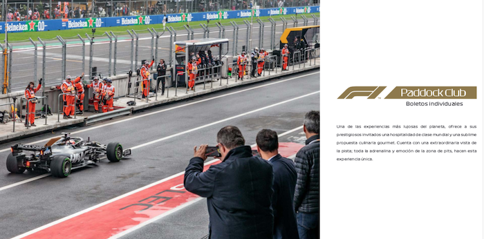 “Una de las experiencias más lujosas del planeta, ofrece a sus prestigiosos invitados una hospitalidad de clase mundial y una sublime propuesta culinaria gourmet. Cuenta con una extraordinaria vista de la pista; toda la adrenalina y emoción de la zona de pits, hacen esta experiencia única”, se puede leer en las características del boleto.