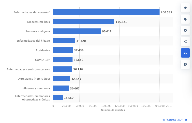 El estudio titulado "Principales causas de mortalidad según el número de defunciones registradas en México en 2022", que llevó a cabo la plataforma global de datos e inteligencia empresarial, Statista, coincidió con la EDR del Inegi, al evidenciar que las enfermedades del corazón ocuparon el primer lugar entre las 10 principales causas de muerte en México durante el 2022.