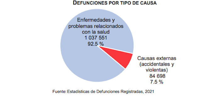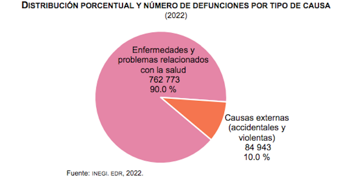 De estas 847 mil 716 defunciones que se registraron en el 2022, 762 mil 773, es decir el 90.0 por ciento, fueron provocadas por enfermedades y problemas relacionados con la salud. Mientras que 84 mil 943, el 10 por ciento, estuvieron relacionadas a accidentes o hechos violentos.