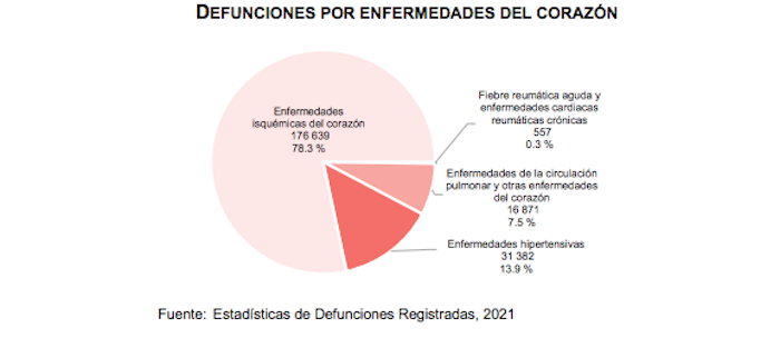 En 2021, la principal causa de muerte fue la COBID-19, ya que provocó 238 mil 772 fallecimientos; el segundo lugar fue para las enfermedades del corazón, con 225 mil 449 decesos, 11 por ciento más que en 2022; la diabetes mellitus, en tercer lugar, provocó la muerte de 140 mil 729 personas; y los tumores malignos fueron la causa de 90 mil 124 fallecimientos, por lo que quedaron en cuarto lugar.