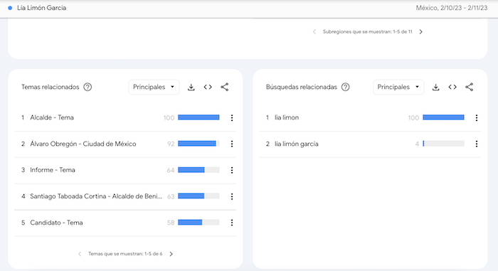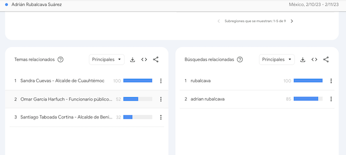 En el caso de las búsquedas de Google, el panorama es menos favorecedor para el Alcalde Adrián Rubalcaba, pues los únicos tres principales temas con los que se le vincula en el último mes no tienen relación con su trabajo en la política, si no con otros funcionarios como la Alcaldesa Sandra Cuevas –con quien difunde videos e imágenes en redes sociales–, con Santiago Taboada y el exsecretario de Seguridad Ciudadana capitalino Omar García Harfuch, aspirante a Jefe de Gobierno con Morena y a quien ha descrito como su amigo.