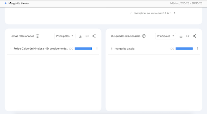 Ambos están debajo de la Diputada Margarita Zavala, con 14 por ciento de las preferencias. A inicios de mes la exaspirante a la Presidencia en 2018 pidió al Frente Amplio por México que no la descartaran de la competencia por el Gobierno capitalino. Pese a ocupar una diputación federal desde 2021, usuarios de Google no la relacionaron en el último mes con su trabajo legislativo, si no con su relación con el expresidente Felipe Calderón, su esposo.
