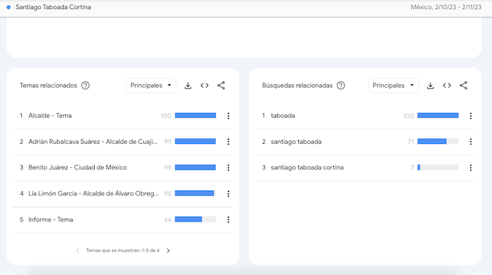 Usuarios de Google sólo mostraron interés sobre el panista al relacionarlo con la demarcación que gestiona desde 2021 y con su último informe de Gobierno presentado este mes. A Taboada Cortina también se le vincula en las búsquedas web con la aspirante Lía Limón, Alcaldesa de Álvaro Obregón, y Adrián Rubalcaba, Alcalde de Cuajimalpa.
