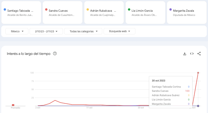 De acuerdo con datos de Google Trends, la herramienta que mide el interés de usuarios sobre diversos temas, del 2 al 30 de octubre las consultas sobre la Alcaldesa Sandra Cuevas alcanzaron un promedio de 18 en la escala del 0 al 100, donde el valor 100 indica la popularidad máxima de un término.