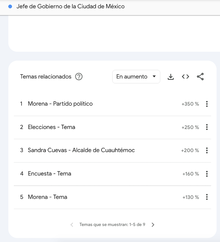 Sandra Cuevas destaca entre los demás aspirantes porque, además de su cargo como Alcaldesa de Cuauhtémoc, los temas y búsquedas relacionados con ella tienen que ver con las polémicas que protagoniza en redes sociales, las dudas sobre si milita o no en algún partido, así como con sus aspiraciones políticas para gobernar la capital, señalan datos de Google Trends. Entre las búsquedas también destacan consultas sobre su cuerpo, algo que no se observa en el caso de los aspirantes hombres.