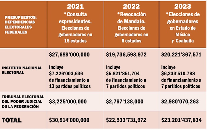 Las dos principales instituciones electorales que estarán presentes en los comicios presidenciales del próximo año, han sumado, juntas, cada seis años, un promedio de incremento presupuestal superior al 40 por ciento, entre los comicios del 2006, 2012, 2018 y 2024.