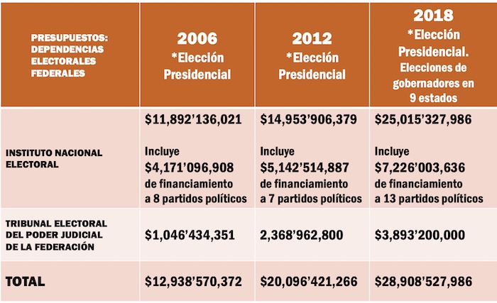 Si revisamos los más reciente procesos electorales realizados en México, veremos que, entre los comicios del 2006, cuando ganó la Presidencia de la República el panista Felipe de Jesús Calderón Hinojosa, y los comicios del 2012, cuando ascendió al poder el priista Enrique Peña Nieto, el incremento en el costo del Tribunal Electoral y del Instituto Nacional Electoral fue del 55.32 por ciento.