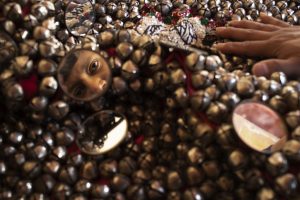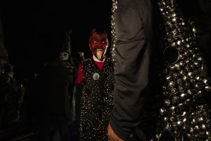 Daniel, que ahora tiene 33, confeccionó su disfraz de diablo semanas antes de la muerteada del 1 de noviembre. No recuerda cuántos cascabeles cosió a la tela roja, pero cuando se mueve con el traje puesto, parece una sonaja. Sus brincos no carecen de esfuerzo: entre pantalón y chaleco, su traje pesa unos 30 kilos.