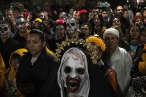 Los mexicanos en el pueblo oaxaqueño celebran la tradicional Muerteada, una recreación teatral que se representa durante la noche del 1 de noviembre hasta la madrugada del día siguiente, con bailes y música desfilando por las calles, mientras se cuenta la historia de cómo un difunto resucita con la ayuda de un sacerdote, un médico y un espiritista.