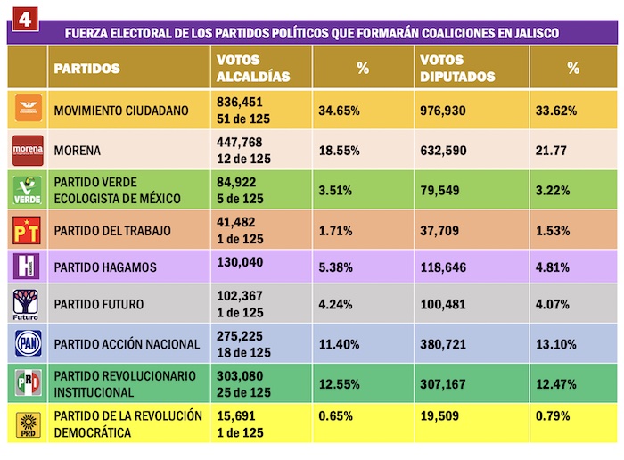 Ciudad de México, 6 de noviembre (SinEmbargo).- Una potente coalición opositora en Jalisco, integrada por Morena, el Partido Verde Ecologista de México (PVEM), Partido del Trabajo (PT) y por dos organizaciones estatales, los partidos locales Hagamos y Futuro, podría poner en riesgo de perder la gubernatura de la entidad a Movimiento Ciudadano (MC).