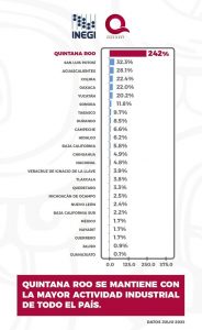 Ciudad de México, 8 de noviembre (SinEmbargo).- Quintana Roo se mantiene liderando la actividad industrial del país, luego de que se disparara al 242 por ciento en el mes de julio, de acuerdo con el Instituto Nacional de Estadística y Geografía (Inegi).