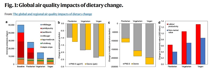 Un nuevo estudio publicado el 6 de octubre en la revista científica Nature Communications llamado “The global and regional air quality impacts of dietary change” investigó la relación entre nuestra dieta y la contaminación del aire. Descubrieron que las dietas basadas en plantas podrían conducir a una reducción significativa de las emisiones de contaminantes tales como el amoníaco y el metano.