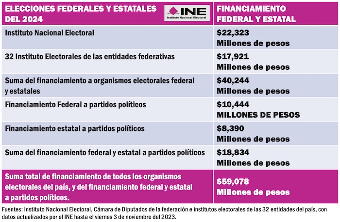 Lo que significa que los contribuyentes aportarán 59 mil 78 millones de pesos para financiar los comicios federales y estatales, solo en lo que corresponde al sostenimiento de organismos electorales y partidos políticos.