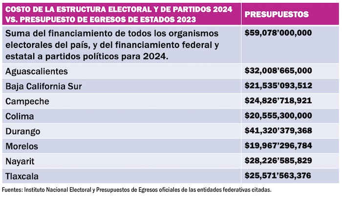 El costo de los procesos electorales locales, en los 32 estados de la República, financiados por los gobiernos estatales, representará durante 2024 un gasto casi tan alto como el que realizará el INE financiado por el gobierno federal.
