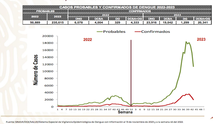 La Secretaría de Salud informó que al corte del 13 de noviembre se han registrado 44 mil 257 casos de dengue durante lo que va del 2023.