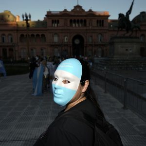 Una votante del candidato presidencial Javier Milei, frente a la Casa Rosada con el rostro cubierto por una máscara con los colores de la bandera argentina. Foto: Rodrigo Abd, AP.