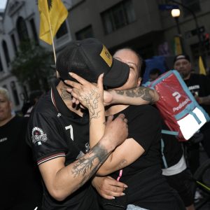 Juliana Bagna y Juan Pérez se besan frente a la sede de la campaña del candidato a la presidencia de Argentina Javier Milei tras el cierre de los centros de votación en la primera ronda de las generales, en Buenos Aires, Argentina, el 22 de octubre de 2023. Foto: Rodrigo Abd, AP.