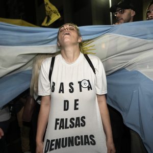 Una partidaria de Javier Milei, con una camiseta con la frase "Basta de falsas denuncias", en el exterior de la sede de la campaña del político tras el cierre de los centros de votación en la primera ronda de las elecciones generales, en Buenos Aires, Argentina, el 22 de octubre de 2023. Foto: Rodrigo Abd, AP.