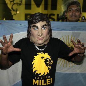 Un seguidor de Javier Milei, con una máscara de león, asiste a un mitin en Buenos Aires, Argentina, el 6 de noviembre de 2023. El candidato suele compararse con un león. El balotaje se celebrará el 19 de noviembre. Foto: Rodrigo Abd, AP.