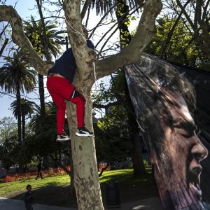 Un hombre se sube a un árbol para poder ver mejor a Javier Milei durante un mitin en Buenos Aires, Argentina, el 25 de septiembre de 2023. Foto: Rodrigo Abd, AP.