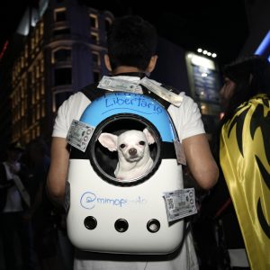Fernando de los Ríos lleva a su perro Luti en una mochila durante un mitin del aspirante a la presidencia Javier Milei en Buenos Aires, Argentina, el 5 de noviembre de 2023. Foto: Rodrigo Abd, AP.