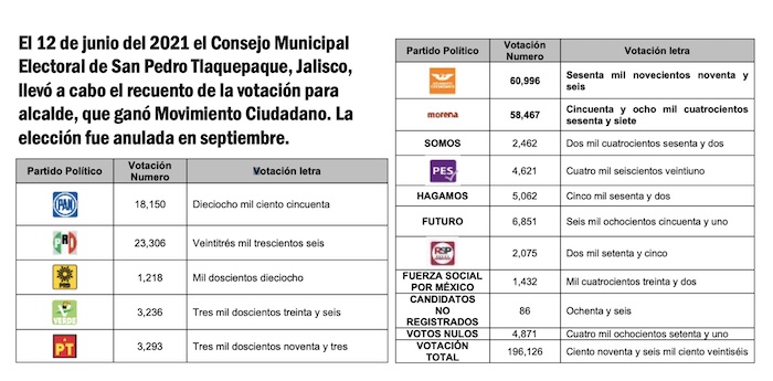 Luego que fueron anuladas las elecciones de presidente municipal en San Pedro Tlaquepaque, realizadas el domingo 6 de junio del 2021, se convocó a comicios extraordinarios, que se llevaron a cabo el domingo 21 de noviembre del 2021. Triunfó nuevamente el partido Movimiento Ciudadano, con su candidata Mirna Citlalli Amaya, quien venció por segunda ocasión en el mismo año al morenista Alberto Maldonado Chavarín.
