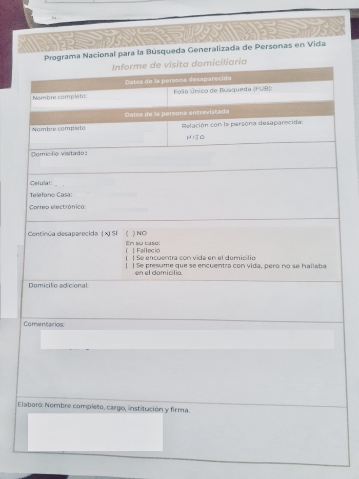 El “informe” que los servidores de la nación piden responder a los familiares es solo para uso oficial. No lo muestran ni entregan una copia. Incluye el nombre de la persona desaparecida y datos personales de quien responde el cuestionario, así como su relación de parentesco con la víctima. El documento, del que este medio tiene copia, cuenta además con un Folio Único de Búsqueda (FUB).