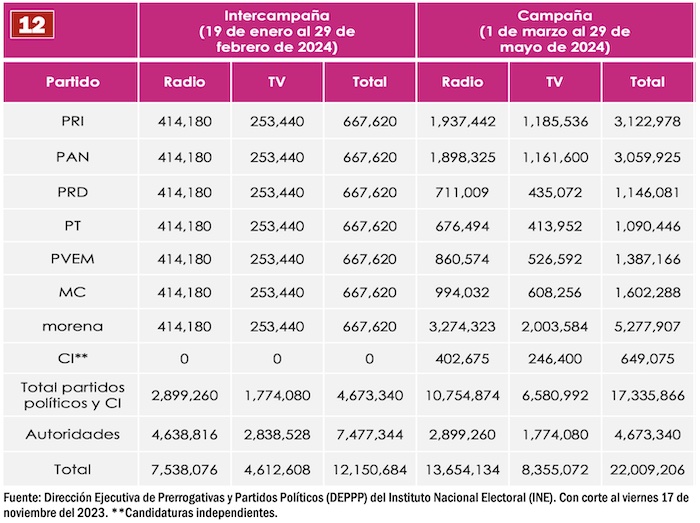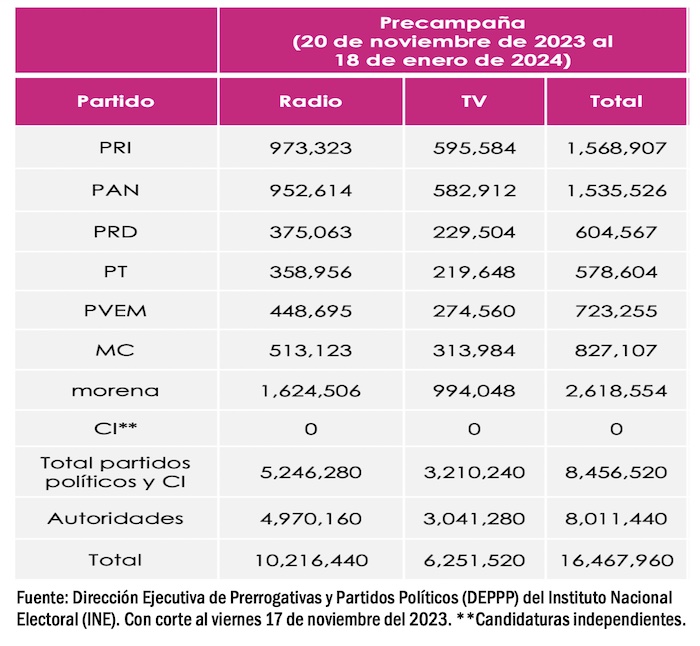 La coalición que encabeza Morena dispondrá, en conjunto con PT y Partido Verde, tendrá un total de 3 millones 920 mil mensajes, mientras que la coalición opositora de PAN-PRI-PRD podrá difundir hasta 3 millones 709 mil mensajes político electorales durante el periodo de precampañas. A Movimiento Ciudadano sólo le corresponderán 827 mil 107 spots en radio y televisión entre el 20 de noviembre del 2023 y el 18 de enero del 2024.