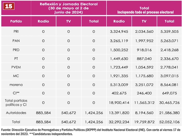 Los mensajes publicitarios que se difundirán en esta etapa de precampañas, comprenden apenas un tercio de los 52 millones de spots que los partidos políticos y sus candidatos, así como la autoridad electoral difundirán hasta el día de la jornada electoral el domingo 2 de junio del 2024.