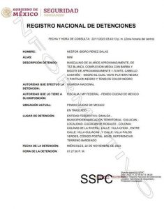 "El Nini" fue ingresado al sistema del Registro Nacional de Detenciones de la Secretaría de Seguridad y Protección Ciudadana a las 15:47 horas de la capital del país.