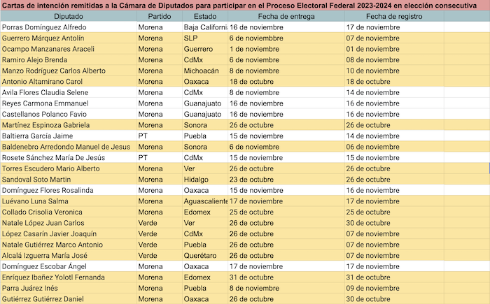 Cartas de intención remitidas a la Cámara de Diputados para participar en el Proceso Electoral Federal 2023-2024 en elección consecutiva de marcelistas. Foto: SinEmbargo.