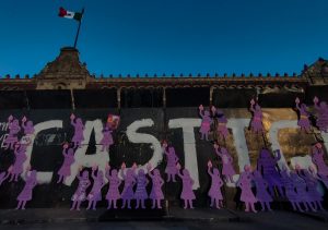 Colectivos feministas cubrieron parte del Zócalo, frente a la sede presidencial, de cartones rosas que simulaban lápidas. Donde debía leerse el nombre de la difunta aparecía la palabra "feminicidio".