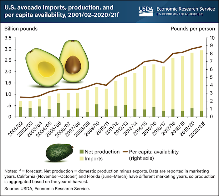 Aunque desde el 2000 el país del norte produjo alrededor de 400 millones de libras de aguacates por año, en el 2011 la producción disminuyó por lo que las importaciones tuvieron que aumentar para respaldar la demanda del fruto en EU.