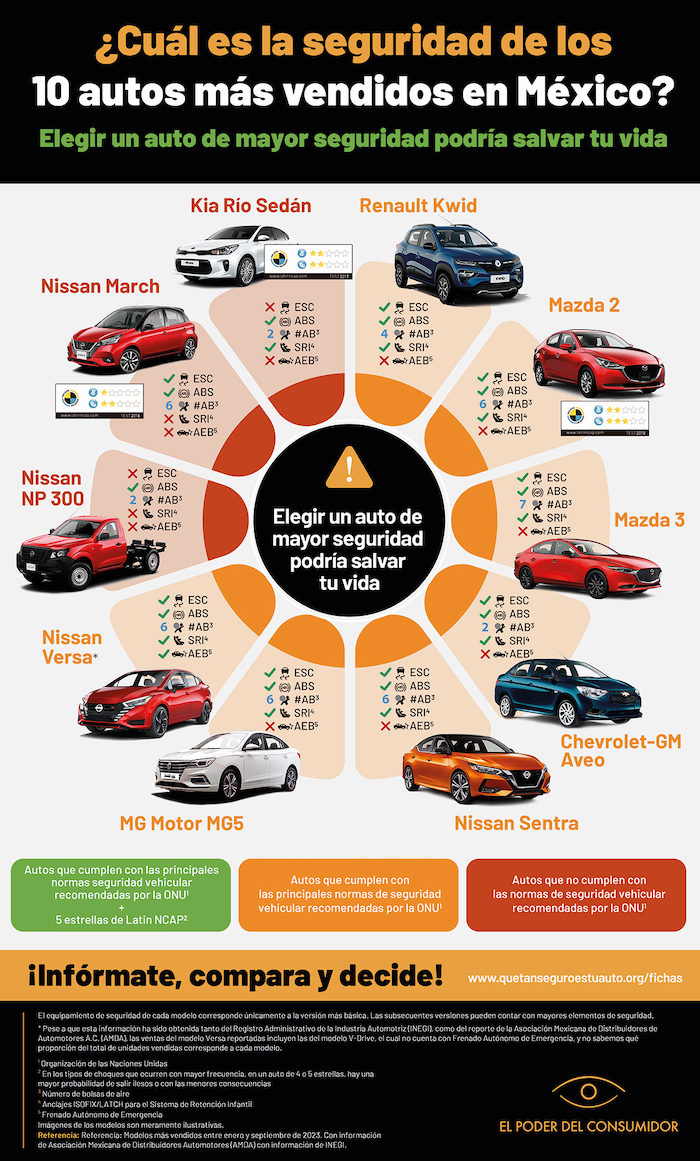 Datos publicados este martes por El Poder del Consumidor muestran que ninguno de los 10 autos más vendidos en México en 2023 pueden considerarse de mayor seguridad para las y los consumidores, ni para usuarios de las vías. Los 10 modelos analizados fueron: Nissan Versa, March, Sentra y NP 300; Chevrolet-GM Aveo, Kia Río Sedán, MG Motor MG5, Mazda 3, Mazda 2 y Renault Kwid.