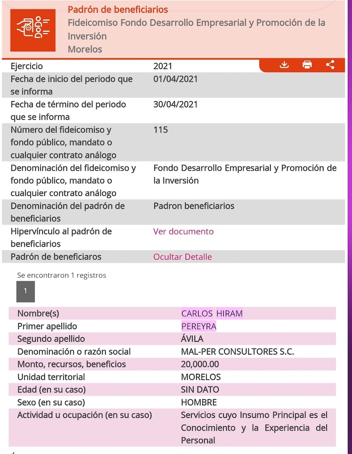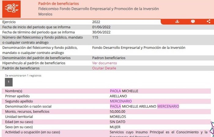 Por otra parte, ha trascendido que tanto Carlos Pereyra como Paola Mercenario recibieron un apoyo por parte del Gobierno de Morelos bajo el concepto de Fondo Desarrollo Empresarial y Promoción de la Inversión, el primero en 2021 por 20 mil pesos y la segunda, quien además ha sido relacionada con el Partido Verde en dicho estado, en el 2022 por 50 mil pesos.