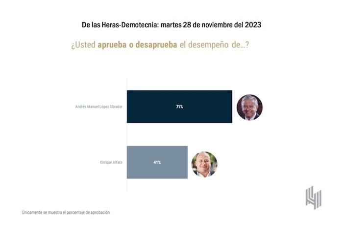 Una hipotética aspirante de la coalición de derecha PAN-PRI-PRD, la presidenta estatal del albiazul en Jalisco, Diana González Martínez, sumaría el 19 por ciento. En la misma encuesta, Claudia Sheinbaum supera con 51 por ciento contra 22 por ciento a Xóchitl Gálvez, y el Presidente Andrés Manuel López Obrador tiene una aprobación del 71 por ciento en Jalisco, contra el 41 por ciento del mandatario emecista Enrique Alfaro Ramírez.
