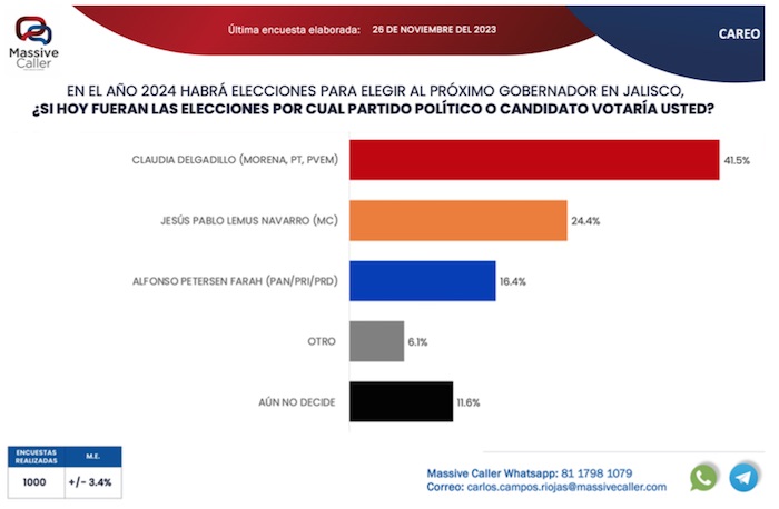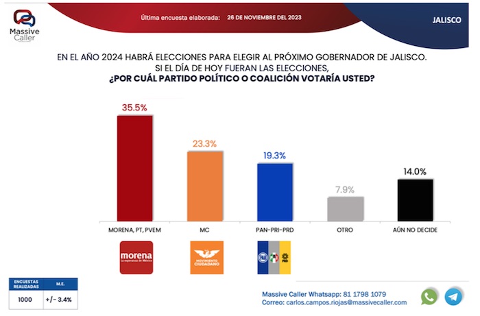 Hay otra encuesta, realizada por la consultora regiomontana Massive Caller, con una singular técnica de “robot”, en grabaciones enviadas a los hogares, que son contestadas por el propio entrevistado, con fecha del domingo 26 de noviembre del 2023, en la cual Morena ganaría la gubernatura de Jalisco con un 35.5 por ciento de aceptación, contra el 23.3 por ciento de Movimiento Ciudadano.