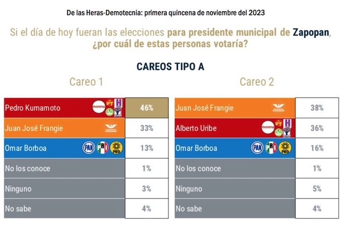 Mientras que en la contienda por la presidencia municipal de Zapopan, como candidato de la colación Morena-PT-PVEM, junto con Hagamos y Futuro, el actual regidor zapopano, José Pedro Kumamoto Aguilar, derrotaría con el respaldo del 46 por ciento de los votos, al actual alcalde de Movimiento Ciudadano, Juan José Frangie, quien pretende reelegirse, y sólo sumaría un 33 por ciento de respaldo.