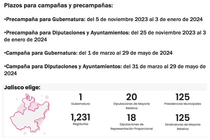 De acuerdo con la planeación dada a conocer tanto por el Instituto Nacional Electoral, como por el Instituto Electoral y de Participación Ciudadana de Jalisco, las precampañas de aspirantes a la gubernatura empezaron el 5 de noviembre del 2023 y terminarán el 3 de enero de 2024.
