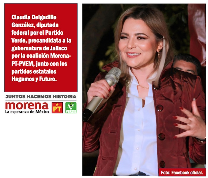 La Diputada federal por el partido Verde, Claudia Delgadillo González, quien encabeza la coalición que integran Morena, Partido del Trabajo, Partido Verde y las organizaciones locales Hagamos y Futuro, ya supera al aspirante naranja, Jesús Pablo Lemus Navarro, del partido naranja en por lo menos dos encuestas.