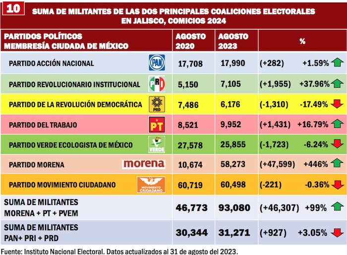 La suma de la coalición opositora le da a Morena una base de operaciones sólida en Jalisco, pues tiene junto con sus aliados una membresía de por lo menos 93 mil militantes constantes y sonantes, un crecimiento de 99 por ciento en un trienio.