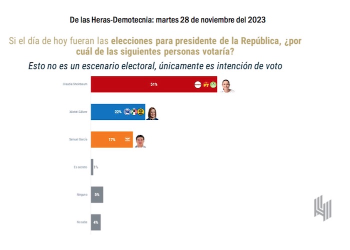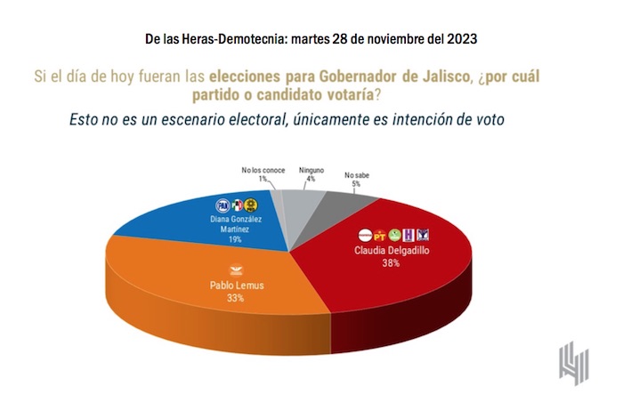 Este martes 28 de noviembre del 2023 la consultora De las Heras-Demotecnia publicó en su plataforma digital una encuesta en la que refleja que si en estos días hubiera elecciones de Gobernador en Jalisco, la candidata de la coalición morenista, Claudia Delgadillo, sumaría el 38 por ciento de los votos, contra el 33 por ciento de Pablo Lemus, de Movimiento Ciudadano.
