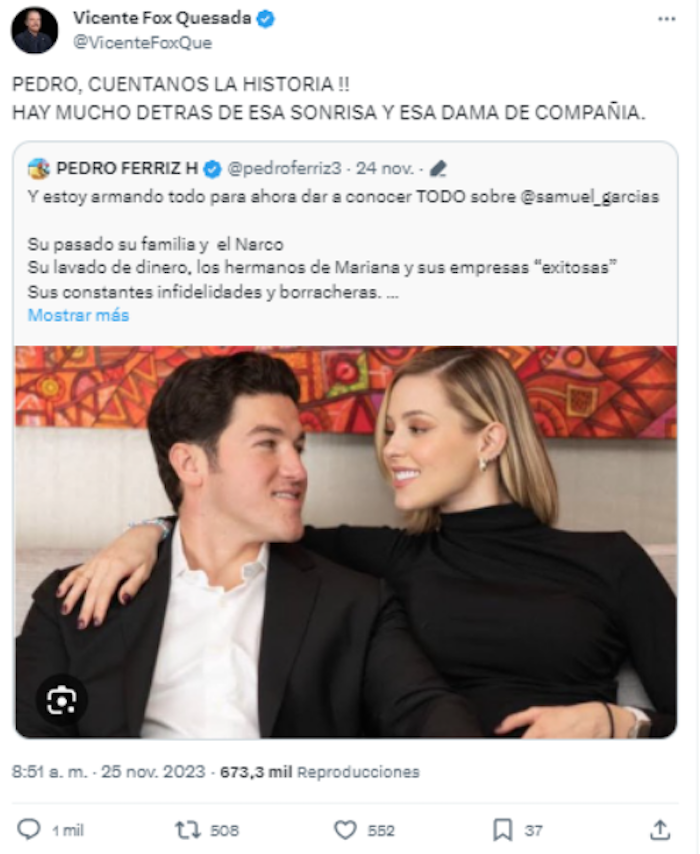 Ciudad de México, 3 de diciembre (SinEmbargo).– “Hay mucho detrás de esa sonrisa y dama de compañía”, escribió Vicente Fox el pasado 25 de noviembre para atacar a Mariana Rodríguez, titular de “Amar a Nuevo León” y esposa del Gobernador con licencia y ahora fallido precandidato presidencial de Movimiento Ciudadano Samuel García. La agresión causó que el panista perdiera su cuenta de X, pero no se trata de un hecho aislado.