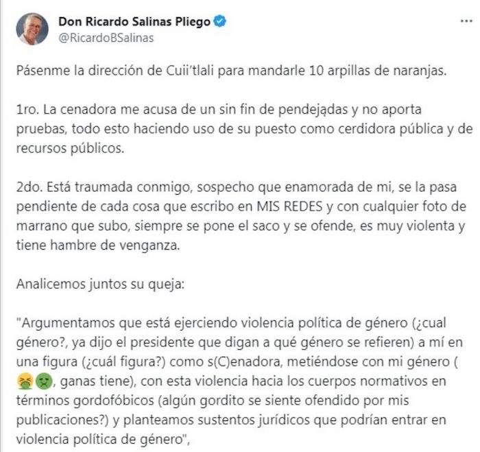 El caso de Ricardo Salinas Pliego ha prendido alertas incluso de las autoridades electorales. El dueño de Grupo Azteca, señalado por evadir impuestos, emplea su cuenta de X para insultar a quien piensa distinto a él, ya sean periodistas, funcionarios de Gobierno o legisladores. Sus ataques, por ejemplo, contra la Senadora Citlalli Hernández, Secretaria General de Morena, han llevado a que el Instituto Nacional Electoral (INE) le ordenara a bajar sus publicaciones por contener violencia política de género, una medida que el Tribunal Electoral dejó sin efecto.