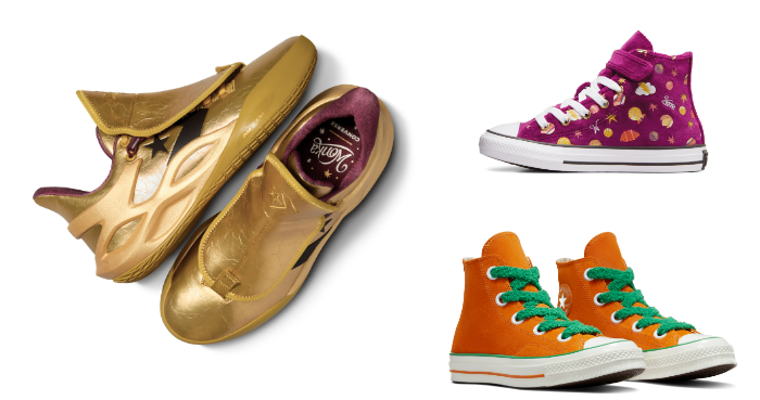 -Converse x Wonka: En colaboración con Warner Bros. Discovery Global Consumer Products, Converse celebra el lanzamiento de Wonka, con una fantástica y divertida colección de calzado, ropa y accesorios. La colección de edición limitada está dirigida a todas las edades e incluye dos combinaciones de colores Chuck 70, uno con materiales de primera calidad "Chocolate Swirl" y otro de ante texturizado "Oompa Loompa". El clásico Chuck Taylor All Star de Converse también llega en dos combinaciones de colores, incluido un "Swirl" en tonos inspirados en el chocolate y un "Corduroy" inspirado en el traje de Willy Wonka. Un All Star BB Trilliant CX en bloques de color dorado tono sobre tono que ofrece un dulce atractivo visual para la cancha.