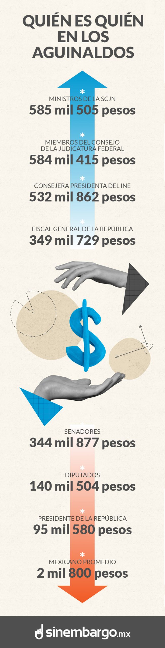 Ciudad de Mexico, 10 de diciembre (SinEmbargo).- El salario promedio mensual de los mexicanos en 2023 ascendió a 5 mil 610 pesos lo cual implica un aguinaldo para este diciembre de 2 mil 800 pesos, una cifra que contrasta con el más de medio millón de pesos que recibirán, por ejemplo, los ministros de la Suprema Corte de Justicia de la Nación (SCJN), uno de los más cuantiosos entre los funcionarios públicos.