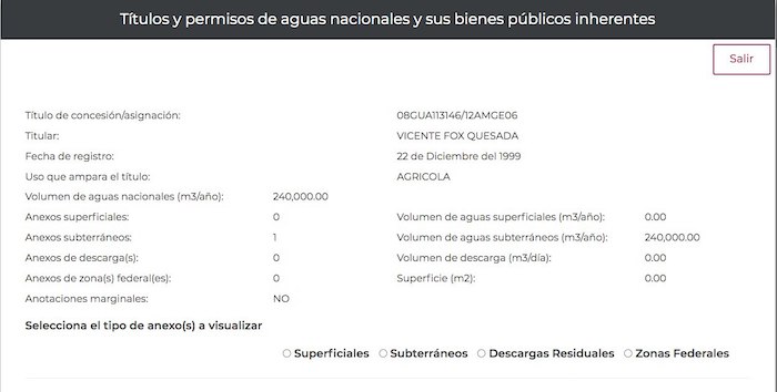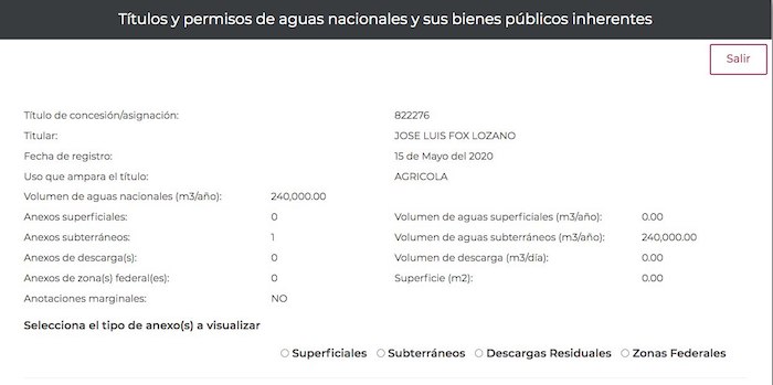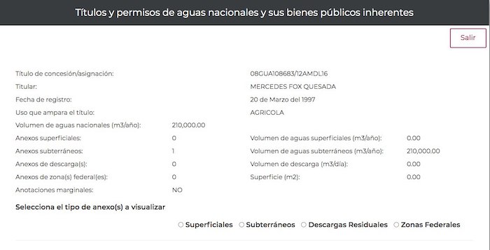 El Registro Público de Derechos de Agua (Repda) tiene los datos de los permisos otorgados a Vicente, Javier, Mercedes, María Cecilia y Susana Fox Quesada y otros más a José Luis Fox Lozano, sobrino del expresidente.