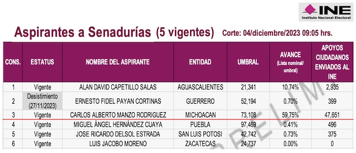 Hasta el corte del 4 de diciembre del 2023, Carlos Alberto Manzo Rodríguez, de Michoacán, había reunido ya 47 mil 651 firmas de apoyo, del total de 73 mil 108 que necesita, para poder reclamarle al INE su derecho a ser inscrito como candidato independiente al Senado de la República. En 73 de 90 días que tiene para cumplir el requisito de los apoyos, Manzo Rodríguez sólo reunió un promedio de 652 firmas diarias; estar en la boleta, necesitaría agregar mil 497 firmas cada 24 horas, entre el 5 y el 21 de diciembre del 2023.